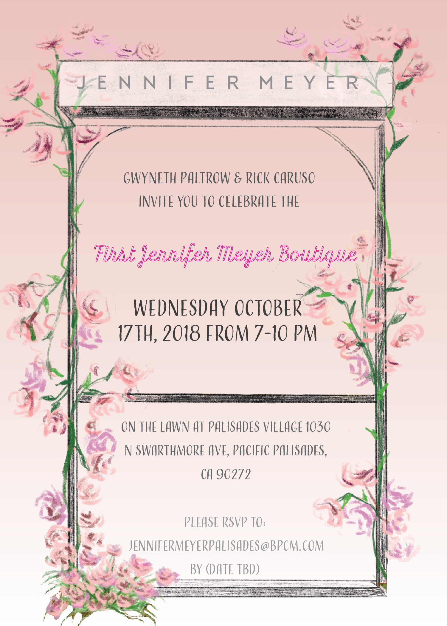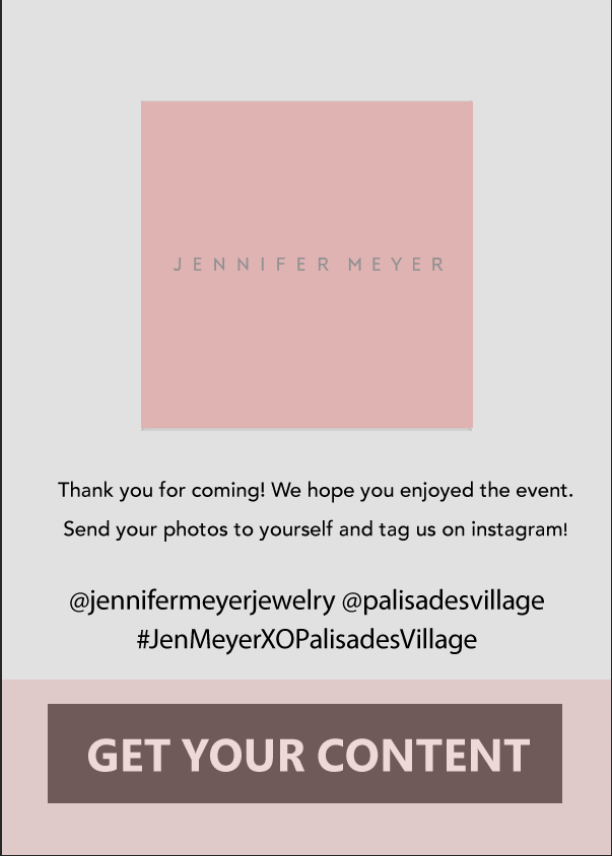 While working for Fire and Creme, I worked on Jennifer Meyer’s Jewelry store opening in Palisades Village. I designed print invitations, signage, menus, custom match books, created a photo moment and branded photobooth screen for the event in Fall 2018. You can find Vogue’s article on the event here.