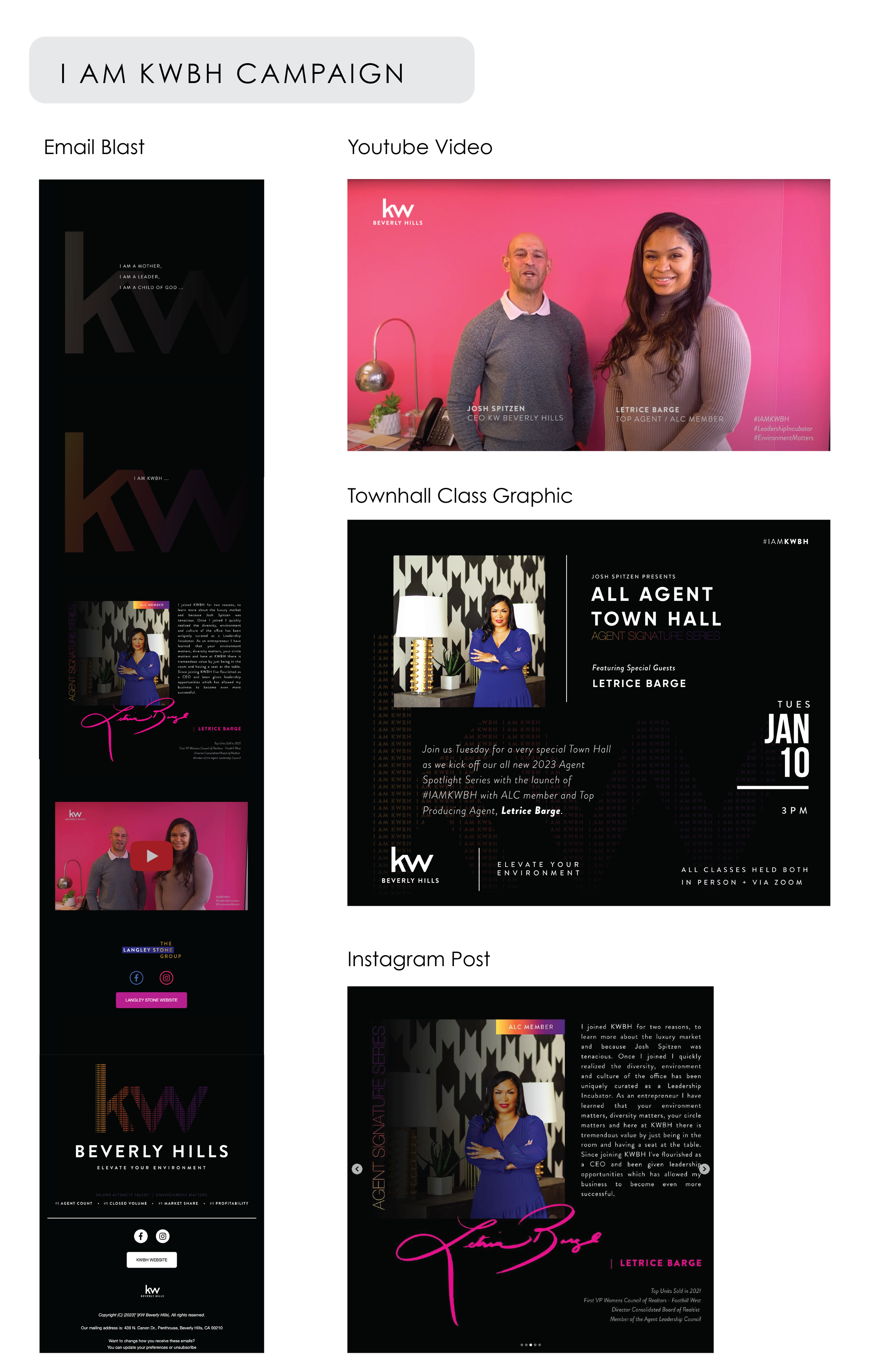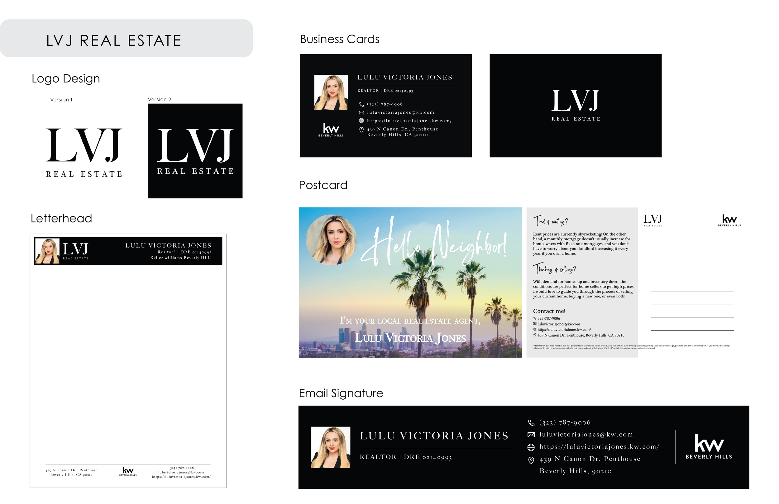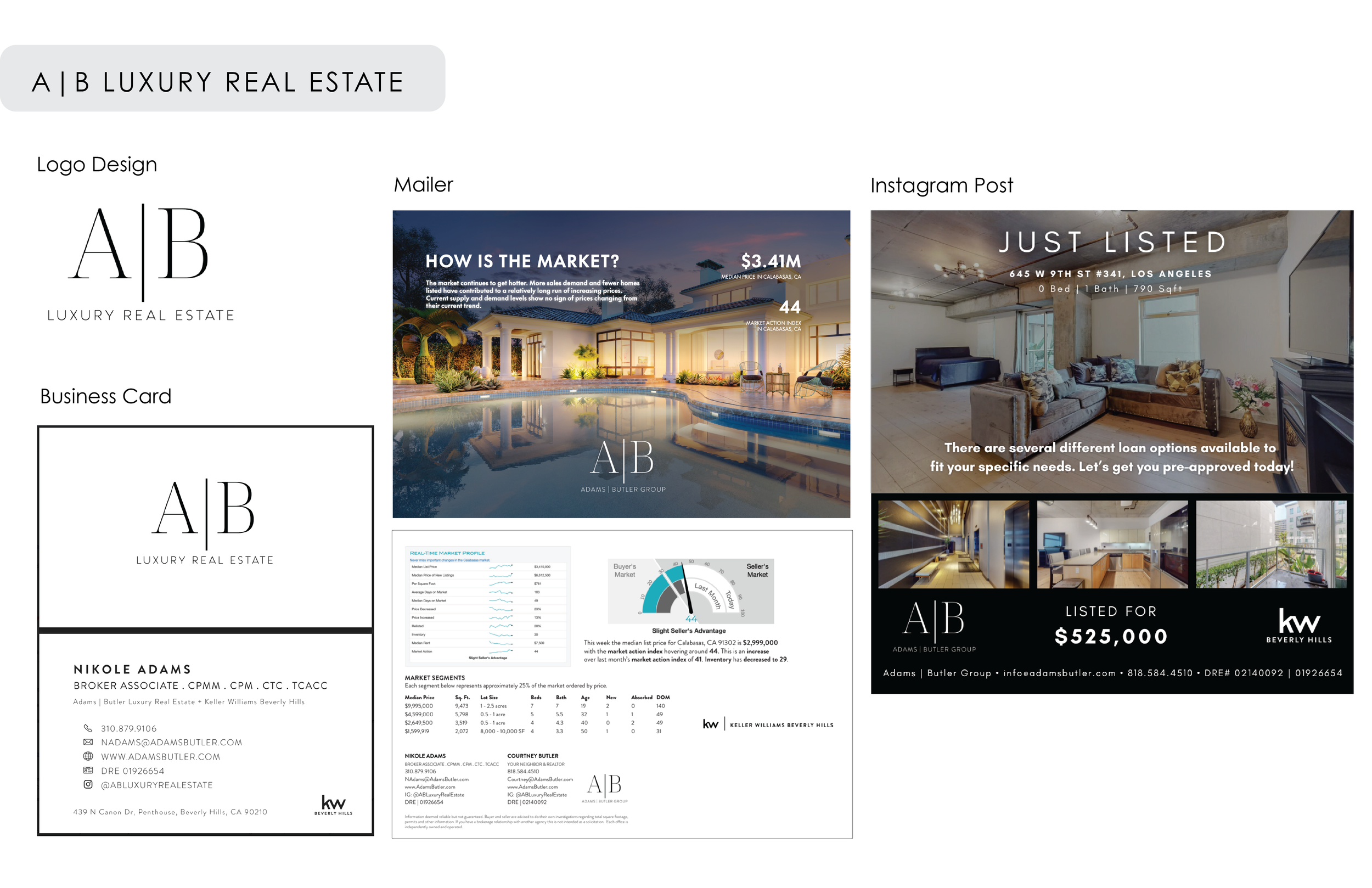 While working as an in-house Marketing Coordinator at Keller Williams Beverly Hills, I consulted directly with my clients (real estate agents) and produced project pitches with full marketing decks that include both print and digital ad collateral. I also worked alongside the realtors and helped them establish their own visual language for their brands/ create guidelines.